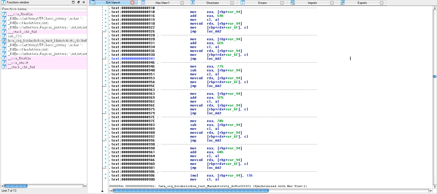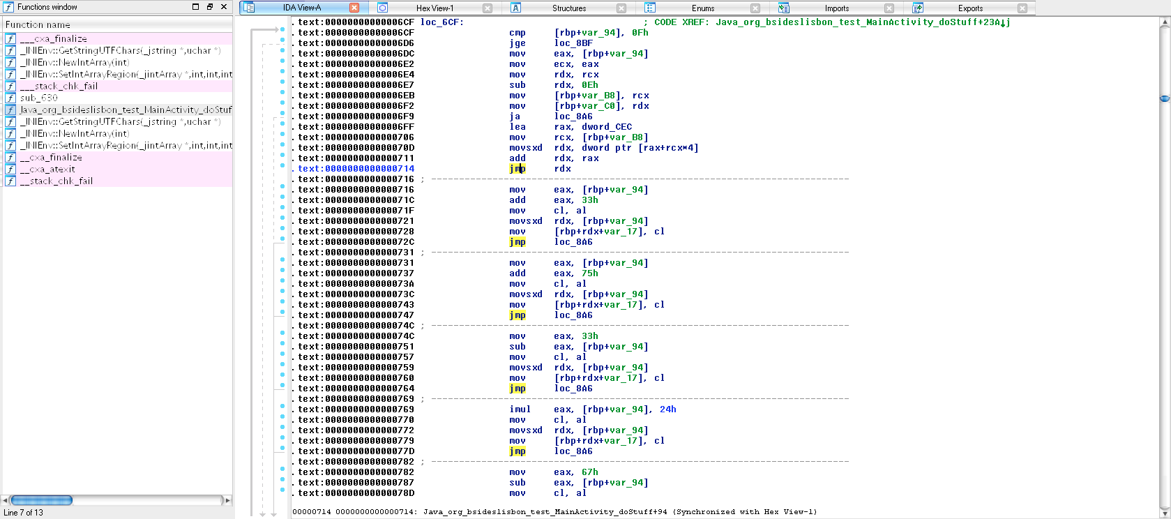 First, it calls _JNIEnv::GetStringUTFChars and stores the result in v10, which is a pointer to a char array, since the next operation involving v10 is *(_BYTE *)(v10 + k). So, v10 is our input as a char array. Then, we have two weird for loops with some jumps: IDA couldn't decompile them (100%) correctly. Let's leave these two for loops in stand by and keep going.