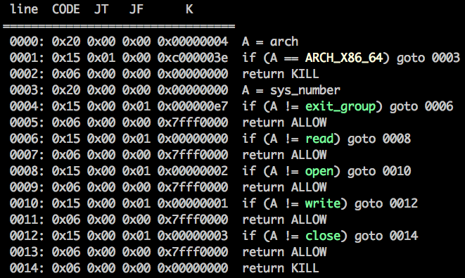 A = sys_number A != open ? ok : next A = args[0] A &= 0xff A == 0x64 ? ok : next return ERRNO ok: return ALLOW