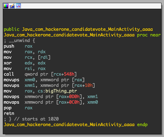 These aa* functions are invoked not only on the Main Activity, but also on other classes. Now, itβs time to understand whatβs going on inside the native library. I like the x86_64 architecture, so I chose to analyze the respective binary, but the app was also compiled for armv7, arm64 and x86. Letβs take a look on MainActivity.aaaa: