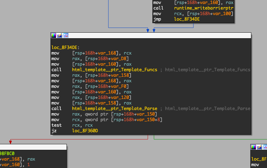 The argument of Template.Funcs is probably a map struct. In Go, function arguments are passed in the stack unlike the standard x64, where arguments are passed in the registers. I found the correct function name: The string located at 0xa3b5cb with length 0xb.