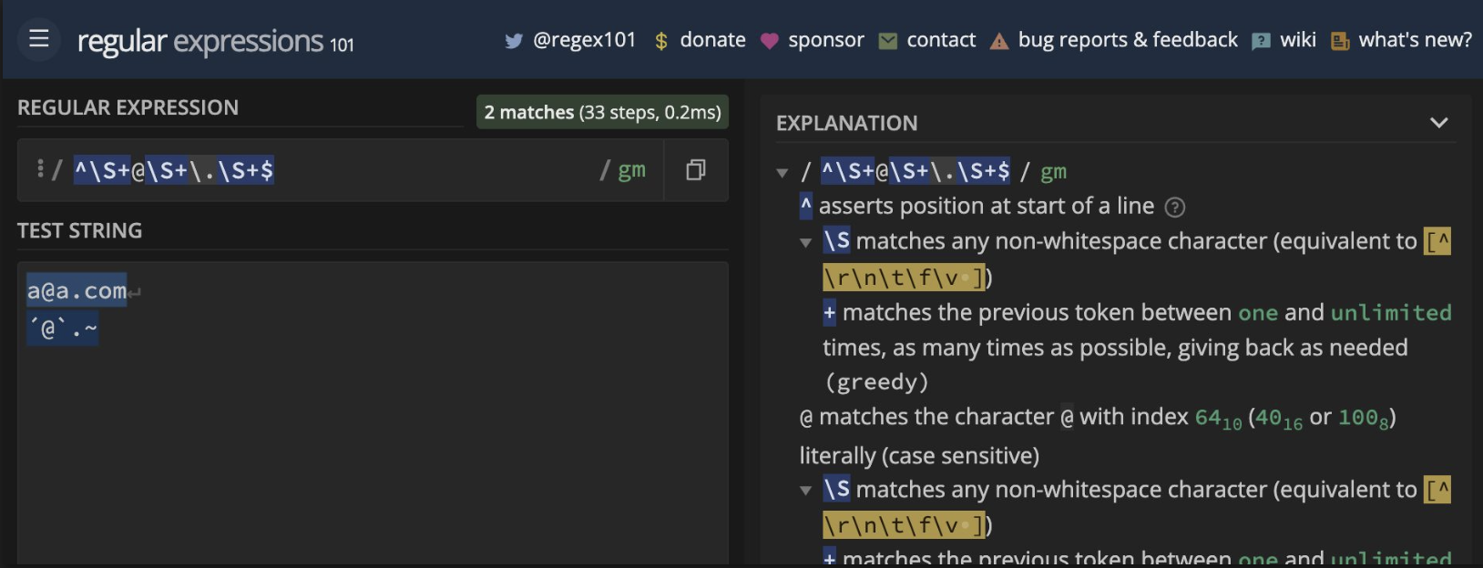 For instance, the aforementioned regex "^\S+@\S+\.\S+$" doesn’t work well for proper email validation: